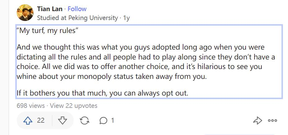 “我的地盘,我的规则。”我们知道这是你们很久以前采用的,当时你们制定所有规则,所有人都必须配合,因为他们别无选择。我们(中国)所做的只是提供另一种选择。看到你抱怨你们的垄断地位被剥夺了,这很有趣。如果这种状况让你感到困扰,你可以随时选择退出。