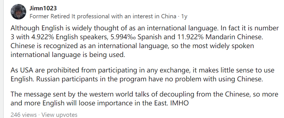 虽然英语被广泛认为是一种国际语言。事实上,讲英语的占4.922%,才排名第三,讲西班牙语的占5.94%,而讲普通话则的占11.922%。汉语是公认的国际语言,因此(空间站使用的是)最广泛的国际语言。由于美国被禁止参与任何交流,所以使用英语没有什么意义。参加该项目的俄罗斯人使用汉语没有问题。西方世界发出的信息是要与中国脱钩,因此越来越多的英语将在东方失去重要性。恕我直言。