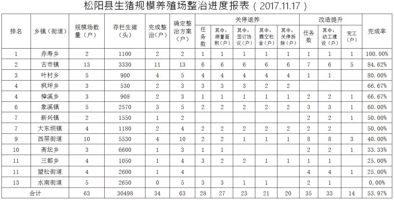 截至11月17日,全县需改造提升生猪规模养殖场共63家,已制定整治方案63家(其中关停退养28家,改造提升35家)。截至目前,需关停退养的28家养殖场已测量27家,包括签订协议23家,栏舍腾空21家,关停拆除20家(即已完成整治);需改造提升的35家养殖场已动工建设33家,其中完工14家(即已完成整治)。