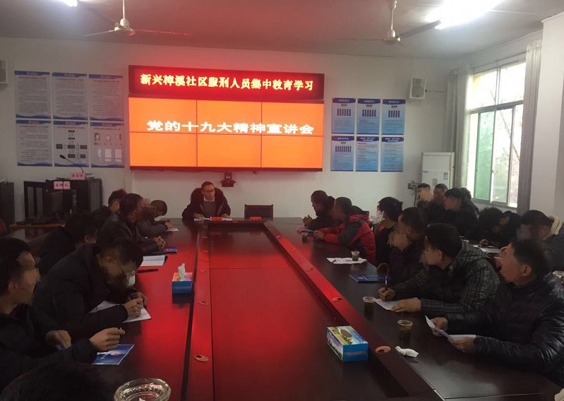12月28日,新兴镇司法所组织片区社区服刑人员开展集中教育学习,宣讲党的十九大精神,并观看《辉煌中国》宣传片。