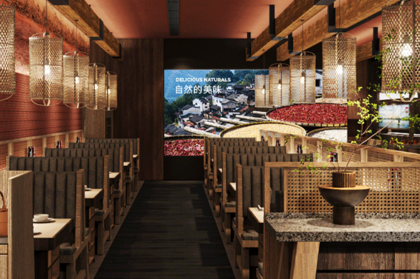 9月初,巴奴官微宣布苏州门店升级,主打“自然风”。与之前“服务不过度,道道都讲究”碰瓷海底捞式的侵略性的视觉标识不同,全新升级的巴奴主打“自然”美味,采用泥、沙、石组成的夯土墙,回归到了所谓“质朴”的状态。