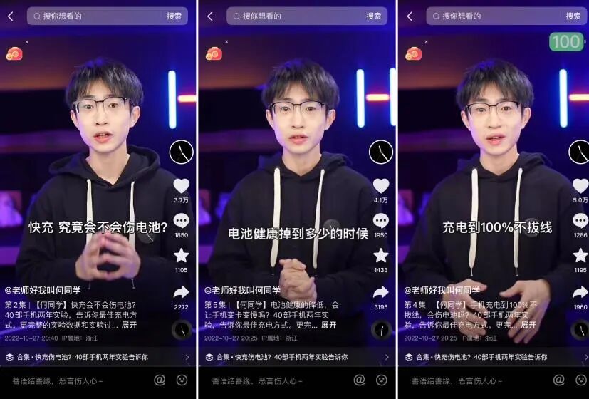 “快充到底会不会伤电池?”“电池健康掉到多少了之后,就该更换电池了。”常规的手机电池话题,似乎回归了数码博主的常态,但也让何同学失去了B站时的魔力,四条短视频点赞量最低的仅有3.7万。