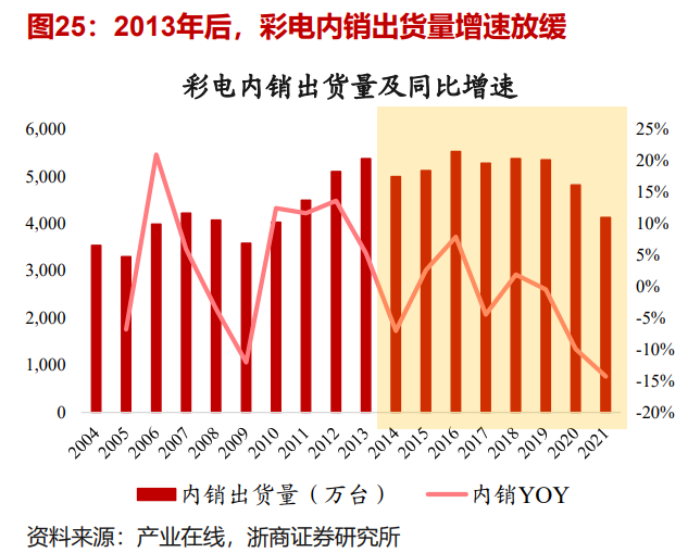 市场前景方面,电视行业陷入连年的市场负增长,浙商证券数据显示,从2013年之后,彩电内销出货量增速快速下滑,2018年后提速尤其明显。