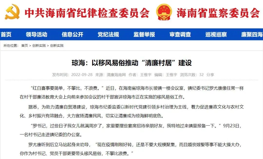 如今,移风易俗的观念和行动已经在群众中遍地开花。群众思想上的转变是琼海市大力推动移风易俗的一个缩影,更是全面打造清廉村居、弘扬清廉民风的有力体现。