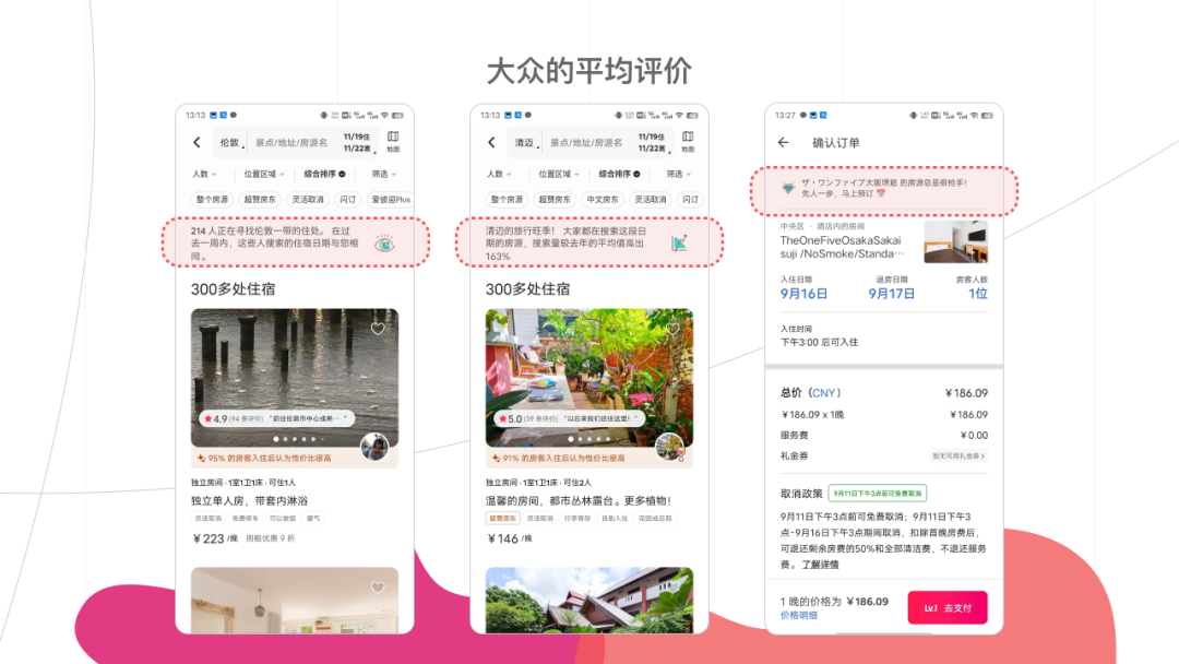 Airbnb在搜索房源后,列表页会在顶部显示区域内的客人对房源平均态度(比如说平均给出的评分、曾经有多少人来过、预定同一时间房源的人数、搜索量较之前时间的涨幅等)。