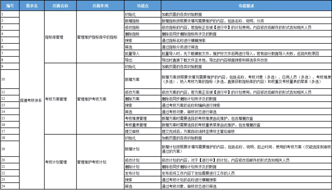其次,功能列表的梳理部分,基于绩效管理的流程图,先写出核心的功能点,并补充其他内容。该模块内容清晰,且完整度比较高。