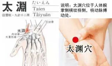 经常用拇指及甲尖掐按太渊,每次1~3分钟,可以补肺气、利心脏,促进血液循环,还可保健心脑血管,预防心肺疾患。