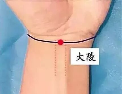 大陵穴在腕掌横纹的中点处,当掌长肌腱与桡侧腕屈肌腱之间。