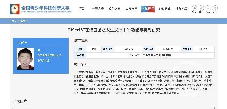 记者核实发现,在全国青少年科技创新大赛官网在线展示栏目中,展示了来自云南代表队生命科学类的小学组参赛项目《C10orf67在结直肠癌发生发展中的功能与机制研究》,项目作者是来自昆明市盘龙区盘龙小学六年级的陈某石。官网显示,该研究项目获得了2019年第34届全国青少年科技创新大赛三等奖。