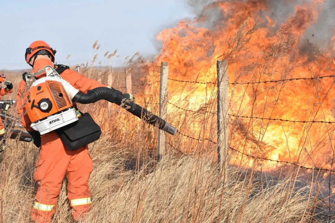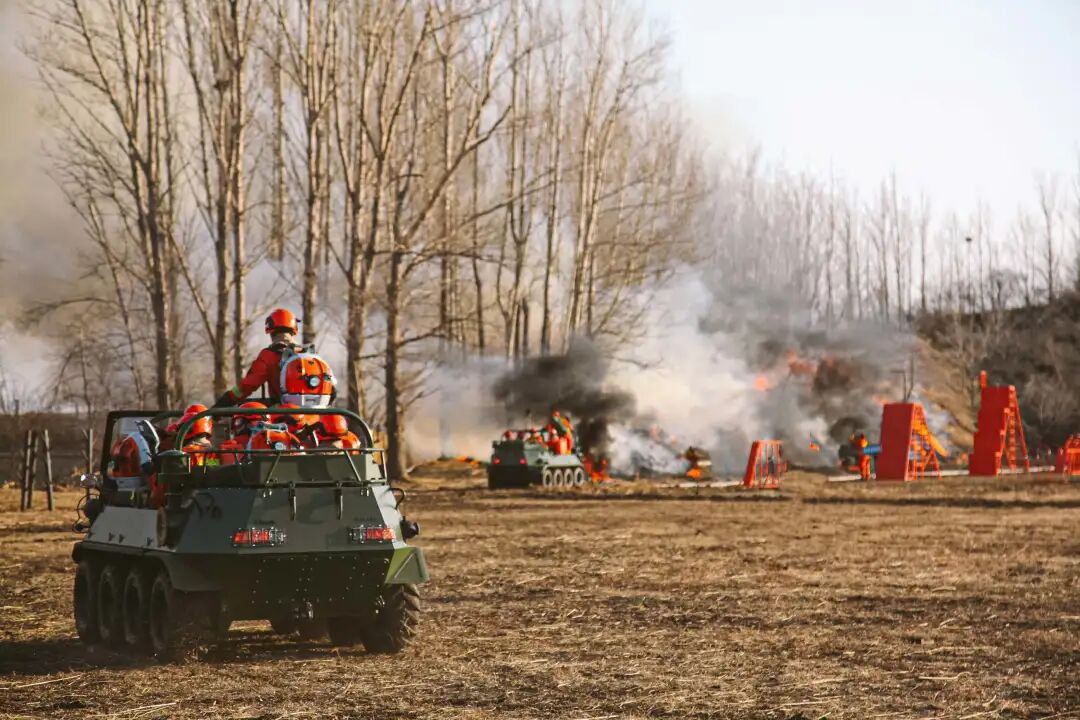 火光中,各分队携带风力灭火机、高压细水雾等常规灭火机具迅速向火场靠近,水泵分队铺设管线完毕,全地形草原灭火战车顺势碾压火线,多管齐发压制火头;联合灭火分队采取“一点突破、分兵合围”“强攻推进、递进超越”等战法,对火场进行全面封控。经过40分钟紧张奋战,明火全部扑灭,火场已达“三无”。