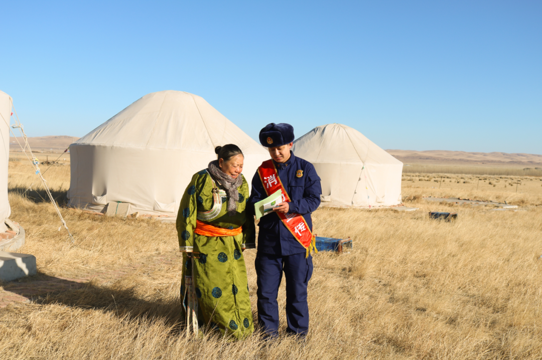谈及和消防大队的缘分,哈斯其其格老人热泪盈眶:“那时候条件很艰苦,消防队的小伙子不仅时常像亲人一样帮助我们,还是我家的救命恩人!”一年冬天,正在单位上班的的哈斯其其格接到医院的电话,原来,因为平房里通风不好,哈斯其其格的父亲煤气中毒晕了过去,被来帮忙清烟囱的消防员发现,他们第一时间背起老人奔向医院,因为抢救及时,老人成功脱险。寒风凛冽中的温情使哈斯其其格深受感动,一段守望相助的故事就此展开。每逢入冬,牧民家家户户都会堆起草垛,稍有不慎,就会引发草原火灾。地广人稀的环境加上语言不通,制约着消防工作的开展,哈斯其其格知道后主动请缨:“只要我在,你就带上我和你们一起去。” 就这样,哈斯其其格成为了西乌旗第一位“消防志愿者”,沟通、翻译、宣传,一干就是几十年。哈斯其其格说,每次进牧区宣传都是一场硬仗,大家背上消防宣传资料、慰问品,骑马深入到几十甚至上百公里外的草原腹地,走一趟往往都是十几天。“除了教牧民防火、灭火知识,我们还教牧民学汉语。遇到家庭困难的牧民缺厚衣物厚被子,我们就把自己的毛毡留给他们。‘消防队’‘119’就这么一步一脚印,一字一句地印在了牧民心里。”哈斯其其格的帮助让大队在草原牧区开展工作顺利了许多,为了让消防员能够更好地开展工作,哈斯其其格每晚到大队讲民族风俗,教消防员唱蒙语歌学习蒙语。正是一代代消防员的坚持不懈,使消防工作在乌珠穆沁草原走出了双向奔赴的群众路线。现在,越来越多的各民族群众加入“北疆蓝焰-蒙古马”消防志愿宣传队,大队还与“红色文艺轻骑兵”乌兰牧骑共同组建“消防乌兰牧骑”宣传小分队,各个宣传队伍游走于草原腹地,确保消防工作不落一村,不落一房。此外,“一唱三学”( 唱民族歌曲,学民族舞蹈,学民族风俗,学民族语言)活动也成为了大队的传统,现在来到大队,消防员们会骄傲地告诉你:“我们来自全国各地,但我们都听得懂蒙语。”![]()