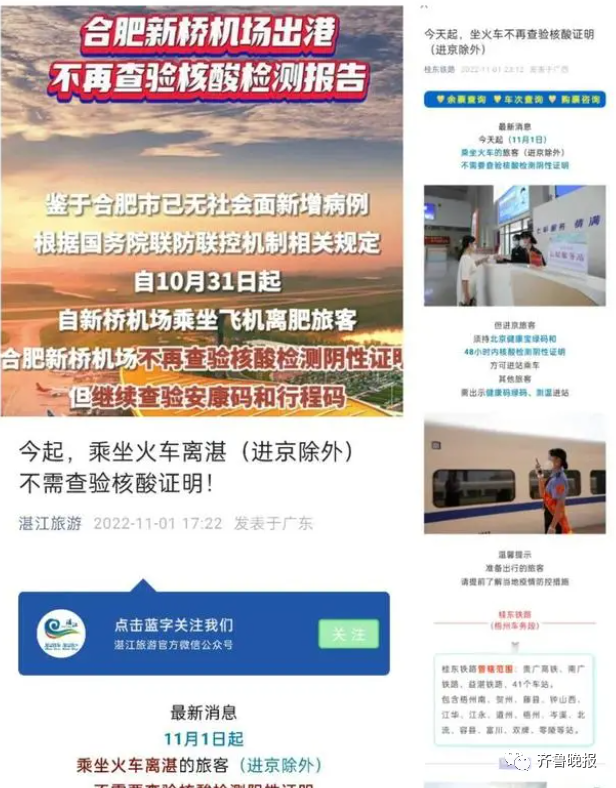 如广东的湛江市旅游局官方微信平台,就在11月1日发布文章《今起,乘坐火车离湛(进京除外)不需查验核酸证明!》,其中指出,11月1日起,乘坐火车离湛的旅客(进京除外),不再需要查验核酸检测阴性证明,但是所有抵湛旅客仍需进行核酸检测。