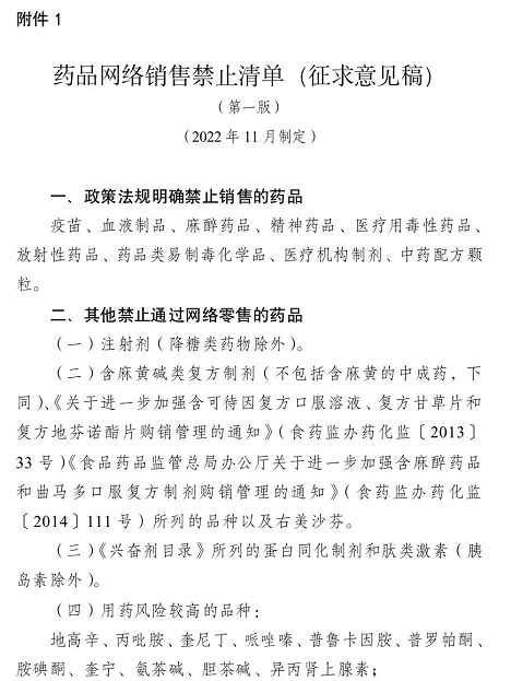 11月4日,据国家药监局网站消息,为进一步完善药品网络销售监管有关政策,明确药品网络销售范围,国家药监局组织起草了《药品网络销售禁止清单(征求意见稿)》。