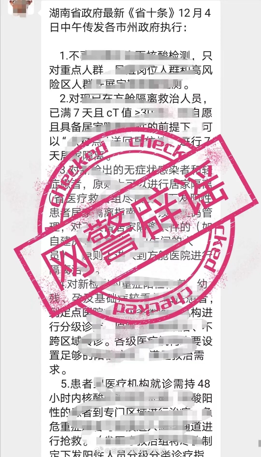 据湖南网警巡查执法官方微博消息,经向相关部门核实,今日网上流传的“湖南省政府最新《省十条》12月4日中午传发各市州政府执行”的消息是不实信息,省政府近日截止目前并未发布如附图所示的所谓的“省十条”。