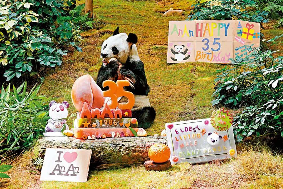 安安去年8月慶祝35歲生日,為全球最長壽的人類飼養雄性大熊貓。 海洋公園供圖