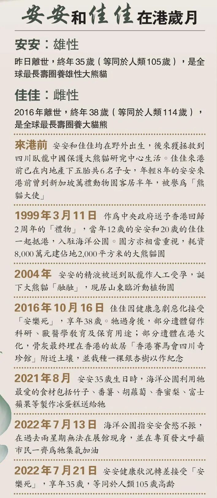 「安安」「佳佳」來港時才讀小學的李小姐,可以說「安安」「佳佳」陪伴她成長,她對「安安」離世感到痛惜。不過,「安安」享年35歲,相等於人類已逾百歲高齡老人。李小姐認為,「安安」雖已離去,但牠一生已圓滿。