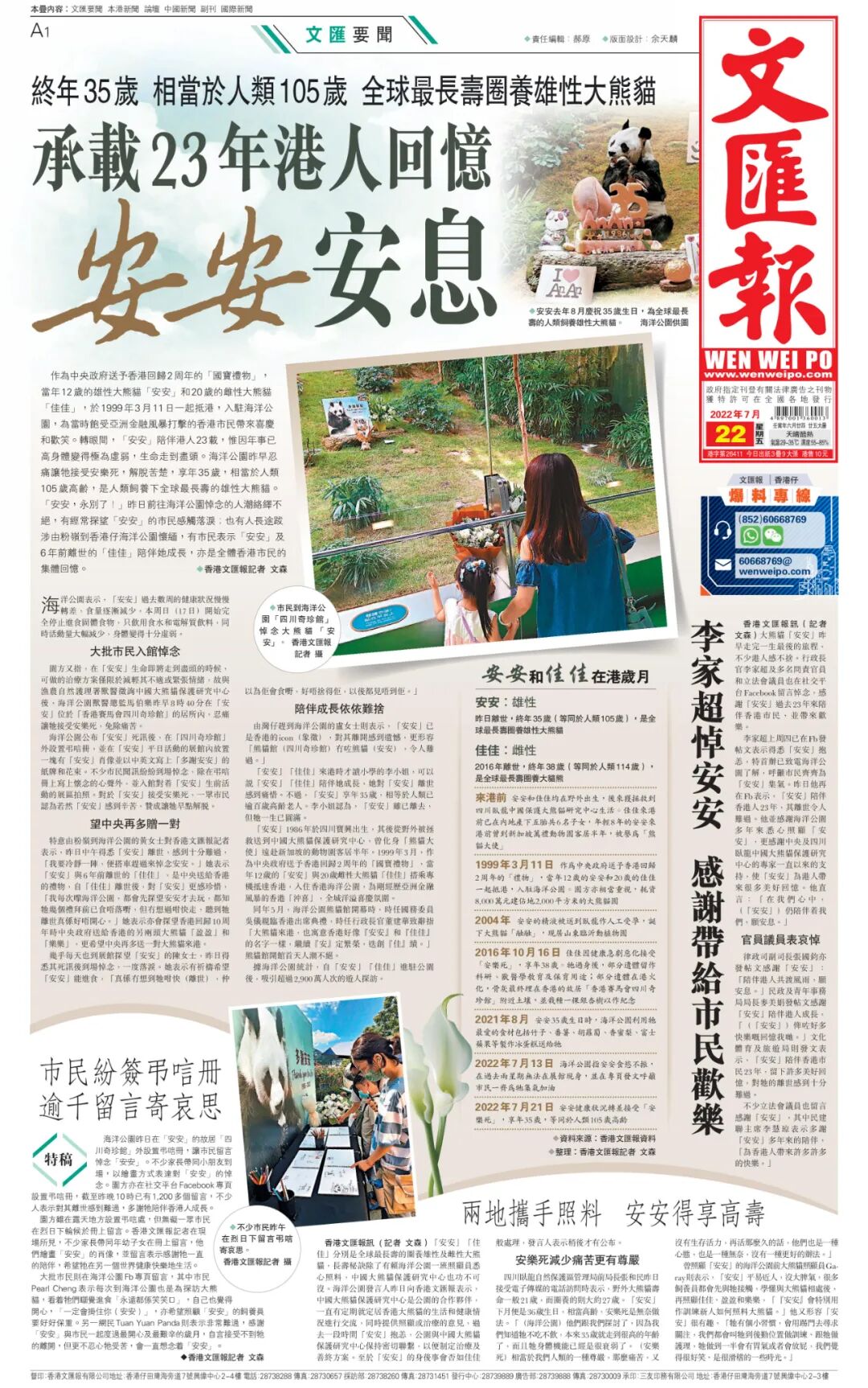 海洋公園昨日在「安安」的故居「四川奇珍館」外設置弔唁冊,讓巿民留言悼念「安安」。不少家長帶同小朋友到場,以繪畫方式表達對「安安」的悼念。園方亦在社交平台Facebook專頁設置弔唁冊,截至昨晚10時已有1,200多個留言,不少人表示對其離世感到難過,多謝牠陪伴香港人成長。