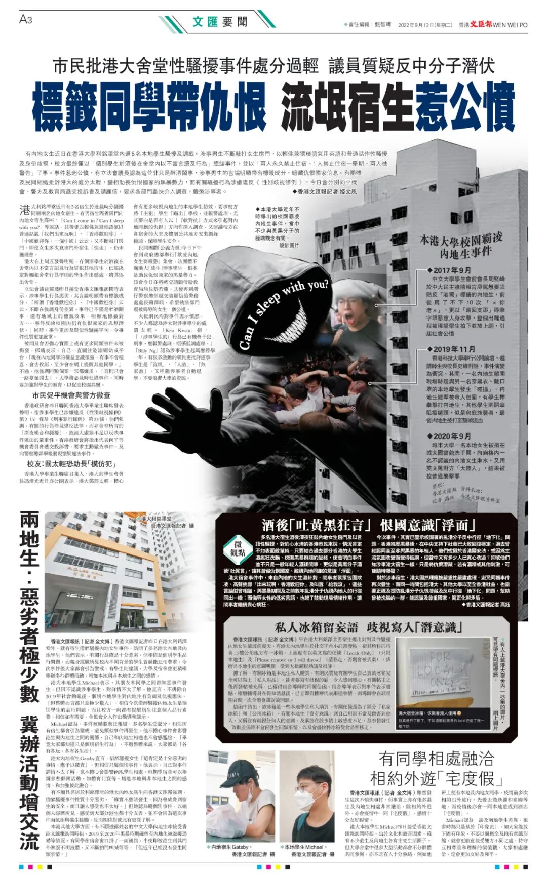 Michael認為,事件被媒體廣泛報道,多名學生受處分,相信所有宿生都會引為鑒戒,避免類似事件再發生。他不擔心事件會影響港生與內地生之間的關係,自己和內地生相遇也不會感尷尬,「畢竟大家都知道只是個別宿生行為」,不過整體來說,大家都是「各有各玩,各有各生活」。 港大內地宿生Gatsby直言,借醉騷擾女生「這肯定是十分惡劣的事情,應予以譴責」,但相信只屬個別事件。他表示,自己對事件詳情不太了解,也不擔心會影響兩地學生相處,但期望宿舍可以舉辦多些群團活動,如體育比賽等,增進本地與非本地生之間的感情,和加強彼此融合。 有不願具名居於利銘澤堂的港大內地女新生向香港文匯報強調,借醉騷擾事件性質十分惡劣,「確實不應該發生,因為會威脅到宿生的安全,而且讓人感受也不太好。」但她認為屬個別事件,以她個人經歷所見,感受到大部分港生都十分友善,並不會因為這次事件而抗拒與港生接觸,反而期待對彼此有更深了解。 本港其他大學方面,有不願透露姓名的中文大學內地生昨接受香港文匯報訪問時指,2019至2020年黑暴時期確曾有內地生被滋擾恐嚇等情況,有同學在宿舍窗口掛了一面國旗,半夜即被港生到其門外淋潑不明液體,又不斷拍門叫喊等等,「但近年已經沒有發生同類事情。」