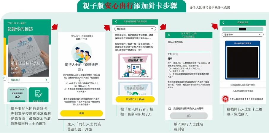 市民進入「安心出行」頁面,按右下方「設定」鍵進入新頁面,然後按右上角更新鍵,即可更新至最新3.4.3版本「親子版」。然後進入首頁,在「電子疫苗接種及檢測紀錄」頁面下方新增的「加入同行人士」選項,輸入同行人士姓名(可自訂別名用作識別)後,掃描匯入同行兒童、長者或殘疾人士針卡二維碼,即完成添加。