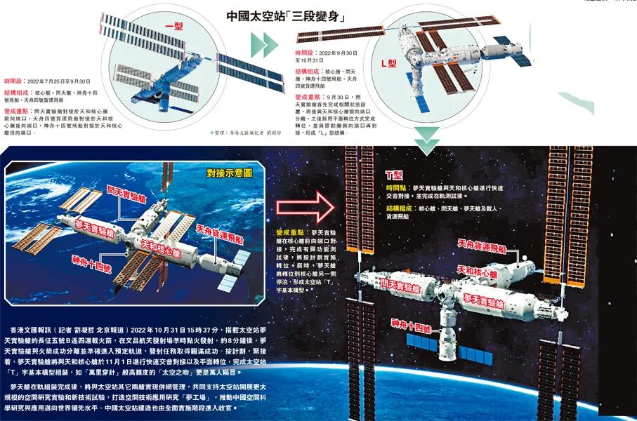 A:問天實驗艙對接形成組合體後,具備接管組合體統一控制與管理功能,而夢天實驗艙不具備獨立控制組合體功能。因此,夢天艙轉位在實際操作流程上,也會與問天艙有所不同。夢天艙轉位過程將分成5個階段,包括轉位準備階段,兩艙分離階段、艙體轉位階段、側向捕獲階段以及轉位後的狀態恢復。完成轉位後,神舟十四號航天員將進駐夢天實驗艙,中國太空站也將正式完成T字構型組合體設置。