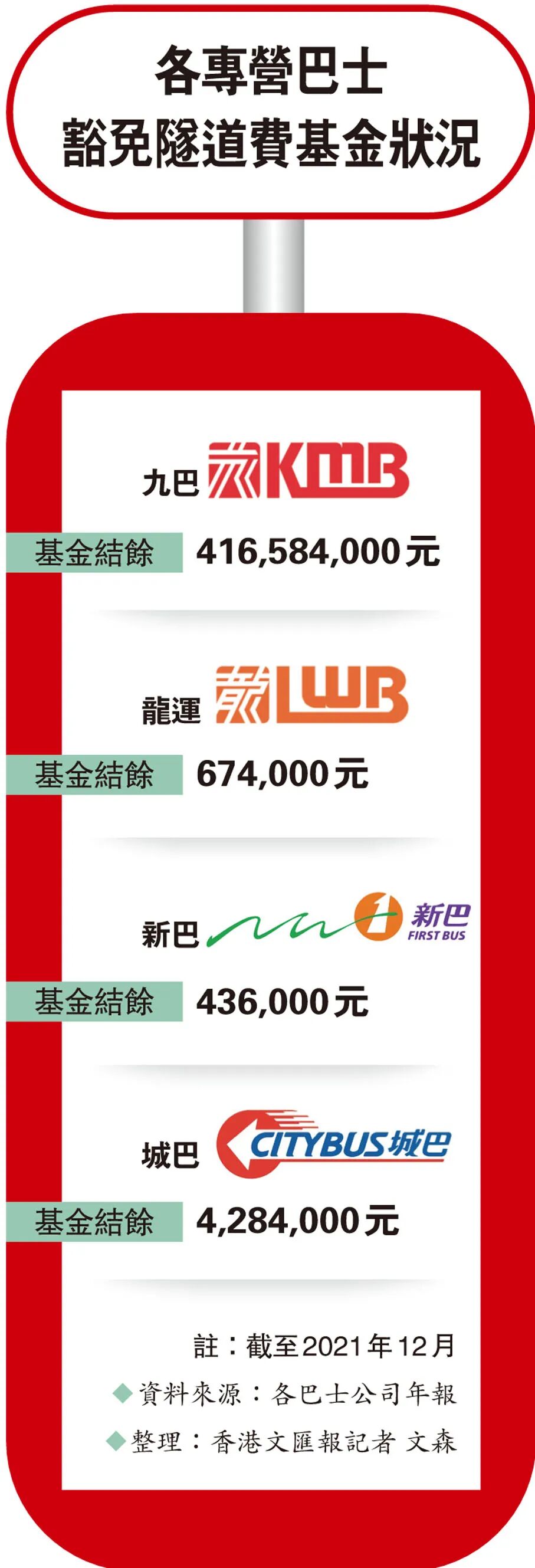 香港文匯報記者翻查了4間巴士公司的年報,發現截至去年底,九巴的隧道費基金約4.166億元,龍運隧道費基金67.4萬元,新巴隧道費基金累計43.6萬元,城巴則錄得428萬元。