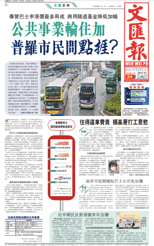 近年經過合併後,專營巴士公司數目縮減、競爭減少,行業利益更集中。四間巴士公司年報顯示,九巴去年盈利約1.06億元,隧道費基金累計約4.166億元;龍運虧損3,684萬元,隧道費基金累計67.4萬元;新巴虧損3,692萬元,隧道費基金累計43.6萬元;城巴虧損1.24億元,隧道費基金累計428萬元。情況反映,巴士公司疫情下確實也面對困難,但表現差別亦很大,仍有巴士公司錄得可觀盈利。使用巴士服務的多是基層市民,尤其是住在偏遠地區的市民,依賴巴士作為返工返學的日常交通工具。巴士加價無疑加重基層市民的負擔。相比於基層市民,專營巴士公司有更強能力抵禦經濟困境的壓力,在艱難時刻不應連年加價,而要多承擔企業的社會責任。