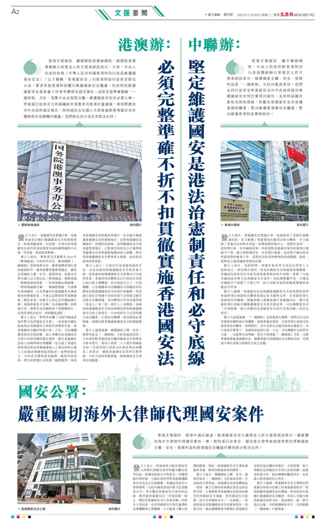 據中聯辦網訊,中央人民政府駐香港特別行政區聯絡辦公室發言人昨日發表談話表示,維護國家主權、安全、發展利益是「一國兩制」方針的最高原則。我們支持行政長官李家超依法向中央政府提交維護國家安全特定事項的報告,支持特區國安委依法採取措施,防範危害國家安全的各種風險和隱患,堅決維護香港國安法權威,堅決維護香港特區憲制秩序。