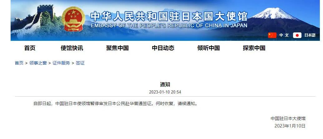中國駐日本使領館暫停審發日本公民赴華普通簽證。(網頁截圖)