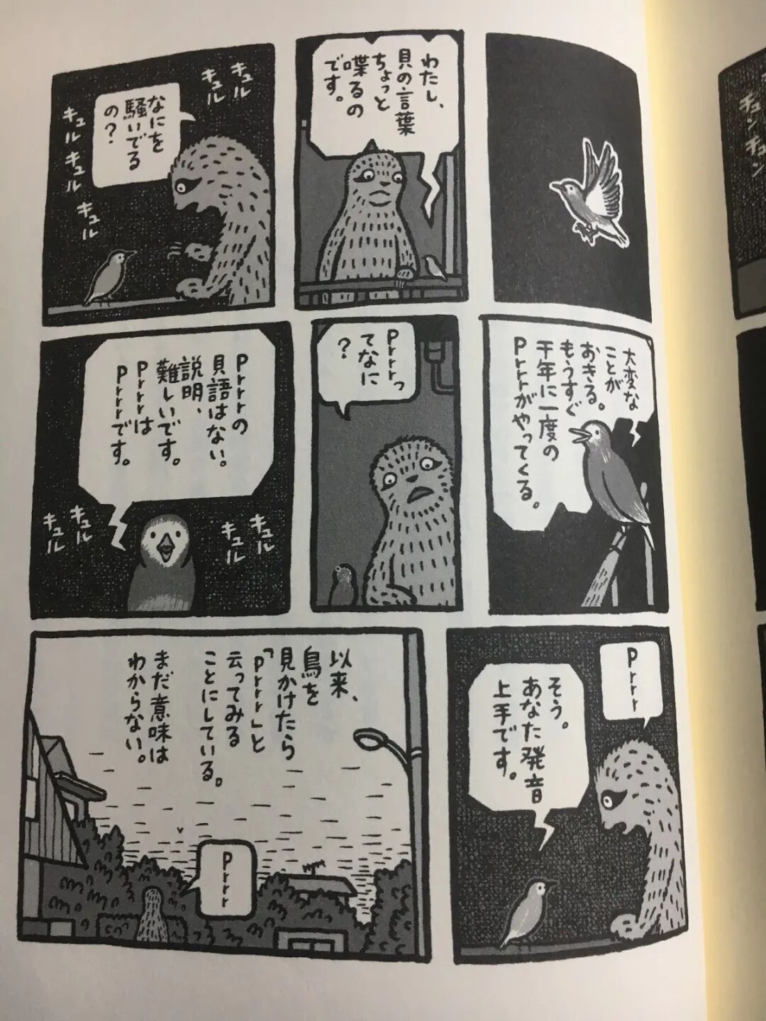 《远迎往影院》和《一舞终了》有相似的内页,配文和插画是同样的内容。比如1994年《远迎往影院》这幅,细节不多,主要表现猫要团结起来,如同字面意思。2004年《一舞终了》这幅,则有了密谋感,狭小的空间,破败的背景,锈蚀的管道,上面还在滴水,形象地展现了猫们堪忧的生存状态。中间的猫脸上有刀疤,身后还有一幅猫画像,可能是为伟大事业牺牲的猫先驱。从这两幅画的对比中,也可以看出藤本理十年间画功的进步。《长度正好的房间》是藤本理的第一部漫画,1998年出版。这部漫画中出现了后来标志性的拟人动物,有北极熊、狮子、绵羊等,它们和人类一样,在满是现代建筑的环境中生活。漫画的灵感来自长岛有,书名取自藤本理喜欢的爱德华·摩根·福斯特的小说《看得见风景的房间》(眺めのいい部屋)。《长度正好的房间》(長めのいい部屋),主妇之友社,1998年。藤本理 著《企鹅斯科特》是藤本理2001年创作的漫画。主人公是一只生活在南极会用电脑的企鹅。因它与其他企鹅格格不入,想法也不同,于是发生了不少啼笑皆非的趣事。这个故事看着很儿童,其实藏着不少属于成人的思考。《企鹅斯科特》(スコットくん),角川书店,2001年。藤本理 著斯科特正目睹外星人把一些濒危动物拐走。出自《企鹅斯科特》《动物大焖锅》是一本四格漫画集,也是藤本理经过断肠般苦思后,从连载六年的漫画作品中筛选出的,笑点都非常冷。比如其中一个故事,一艘轮船沉没,狮子在水里扑腾,旁边的救生筏上有一群猫,规定只有妇女和儿童可以坐。狮子说,虽然我现在是雄性,但我这次乘船是为了去做变性手术。猫们没有同意,狮子在后面大喊:“这是真的!”《动物大焖锅》(いきもののすべて),文艺春秋,2006年。藤本理 著《两周的假期》是藤本理非常重要的一部作品,也是他后期正式出版的长篇漫画之一。主人公日菜子生活在一个不可思议的国度,这里鸟像人类一样生活,而她每天以买烤茄子为生,通篇都是平淡的日常,但也是一场奇特的冒险。创作的契机是,藤本理发现自己小时候读过的《十五少年漂流记》,法语原名是《两年的假期》(DeuxAns de vacances),死里逃生的历险居然被称作“假期”,这让他很吃惊,同时也深受启发。《两周的假期》(二週間の休暇),讲谈社,2007年。藤本理 著主人公日菜子的原型,是片冈MAMIKO,她是一位插画家,也是藤本理的前妻。2015年,她曾发表过一篇纪念藤本理的文章:藤本理去世了。