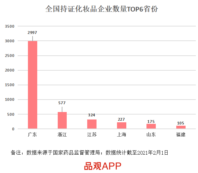 数据显示,截至2021年2月,全国持证化妆品企业数量超过5400家,仅广东省就有2997家,占比超过55%,而这其中,广州就占广东省的70%;上海则有227家,占比仅为4%,数量排在浙江和苏州之后。