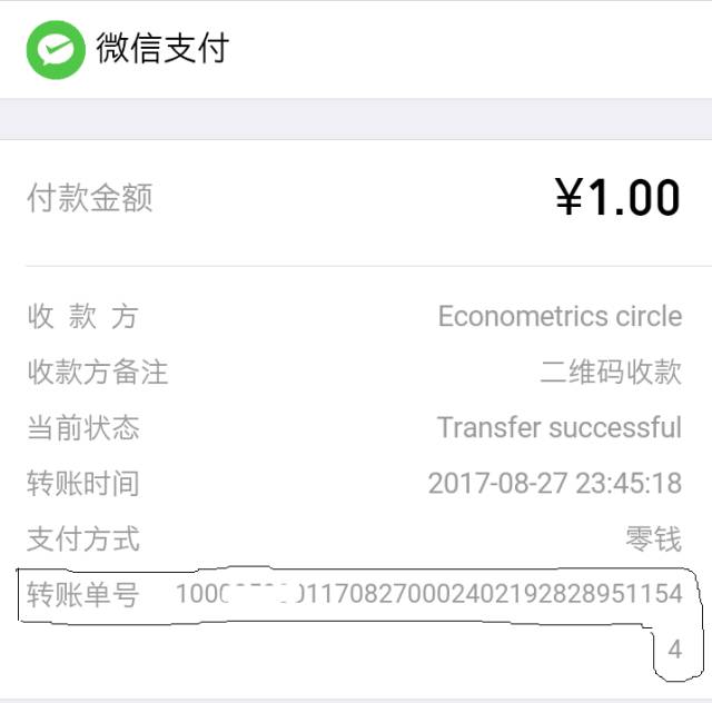 b.然后把“转账单号”里的那一连串数字(比如,下图黑线里的数字)输入到主页菜单“消息框”(这个简单吧),待计量经济圈确认后会迅速地通过这个消息框发送给你这套视频和PPT哦。
