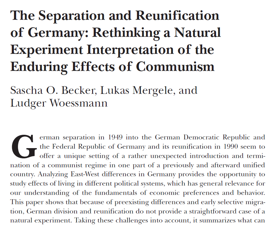 Becker, Sascha O., Lukas Mergele, and Ludger Woessmann. 2020. "The Separation and Reunification of Germany: Rethinking a Natural Experiment Interpretation of the Enduring Effects of Communism."Journal of Economic Perspectives, 34 (2): 143-71. German separation in 1949 into a communist East and a capitalist West and their reunification in 1990 are commonly described as a natural experiment to study the enduring effects of communism. We show in three steps that the populations in East and West Germany were far from being randomly selected treatment and control groups. First, the later border is already visible in many socio-economic characteristics in pre-World War II data. Second, World War II and the subsequent occupying forces affected East and West differently. Third, a selective fifth of the population fled from East to West Germany before the building of the Wall in 1961. In light of our findings, we propose a more cautious interpretation of the extensive literature on the enduring effects of communist systems on economic outcomes, political preferences, cultural traits, and gender roles.