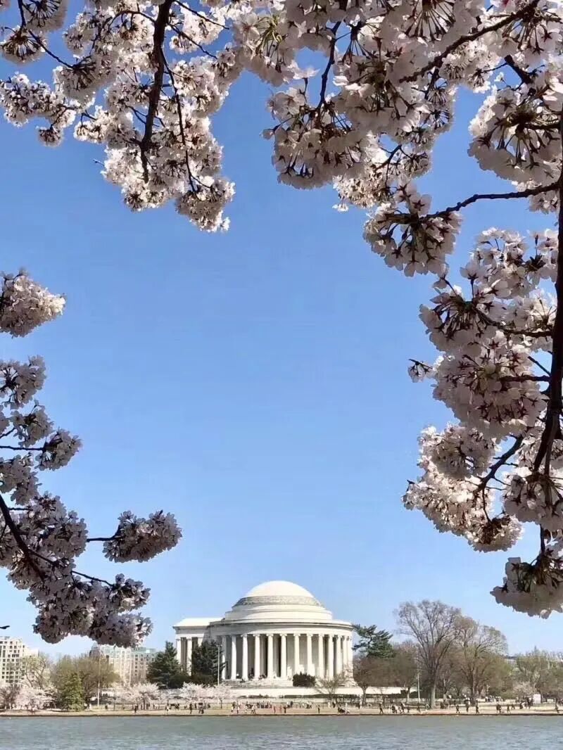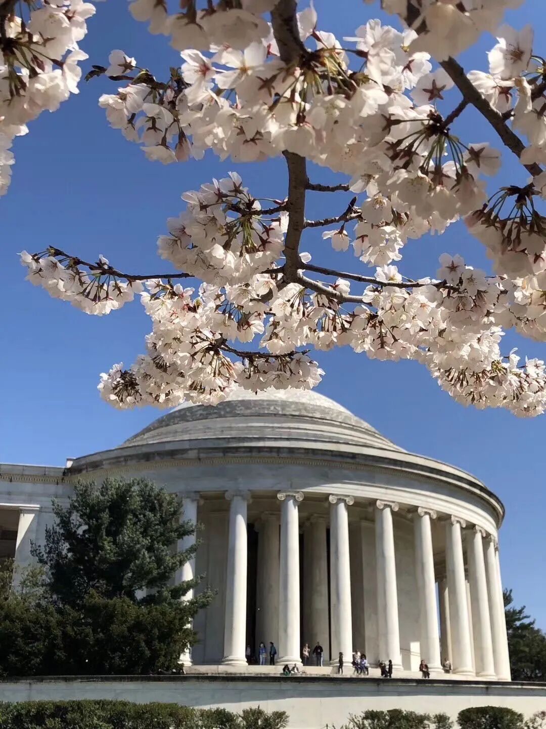 为了欣赏樱花,我先下榻在事先预定的Fairmont Washington DC费尔蒙酒店, 这是我喜欢的富有历史传奇的环球五星酒店, 2018年在肯尼亚首都内罗毕的费尔蒙酒店,我曾住在海明威的套房和《走出非洲》作者凯伦的套房之间,令人热血沸腾。然而在华盛顿费尔蒙住了两晚后,当我提出要续住三天,前台经理讲樱花节期间房源紧张,客房全满,他建议我转去特朗普国际酒店,并当场热情为我打电话预定,就这样我从费尔蒙转到特朗普国际酒店住了三晚。走进巴洛克风格的特朗普酒店大厦,一进门就看见一面约八层楼高的巨幅星条旗装饰在豪华大厅墙上,不同凡响,穿着正装的女士先生们斛光交错,香艳飘逸,酒吧视频正在播放CNN美国众议院弹劾特朗普的预案。前台经理给我的客房虽典雅舒适,却不见浴缸,仅有一个淋浴,我每晚有泡澡习惯,打电话给前台经理,金发碧眼的中年经理很快将我换到两间套房,还亲自上楼帮我拿行李, 他和颜悦色地告诉我樱花节客房很紧,带浴缸的客房已满,因此替我免费升级到带有客厅的豪华套房。那三天享受了周到服务和美食,带来愉悦的回忆,没想到,仅一年过去天翻地覆,纽约林肯中心大都会歌剧院关门了,许多歌唱家小提琴家钢琴家面临失业,华盛顿特朗普酒店为申请联邦补助被美国媒体穷追猛打;一个01微米的诡异的病毒,祸害人间,毁了人们珍爱的日常生活!