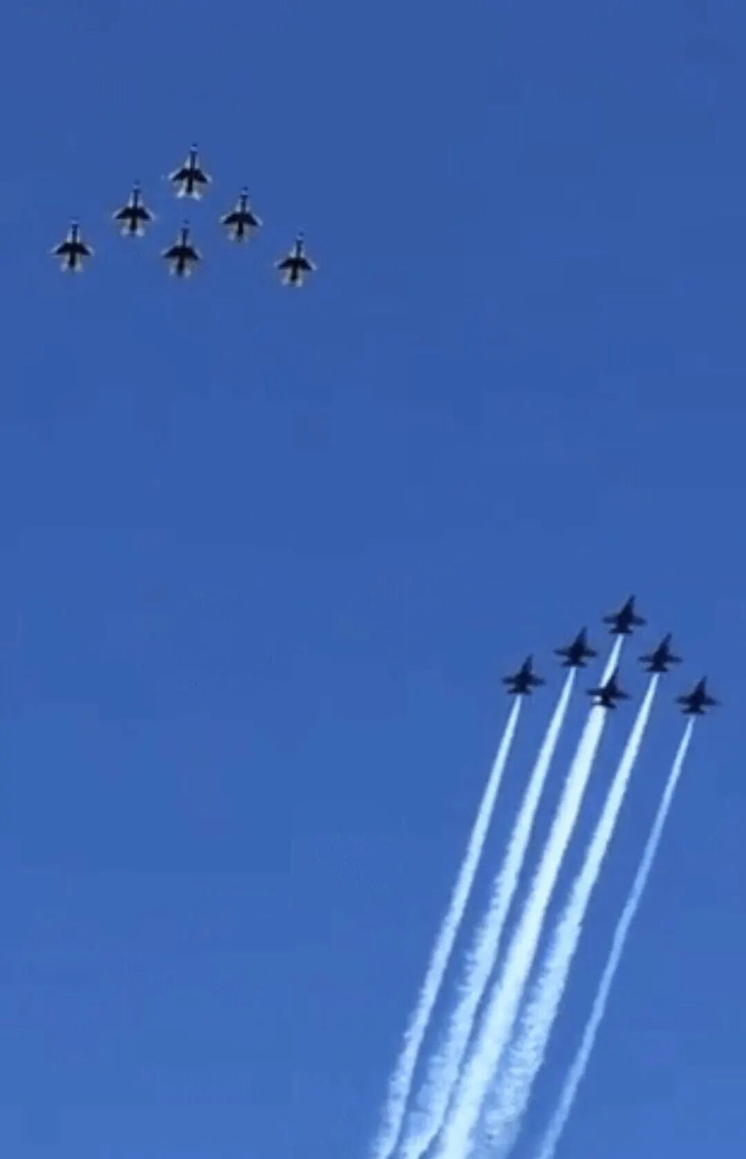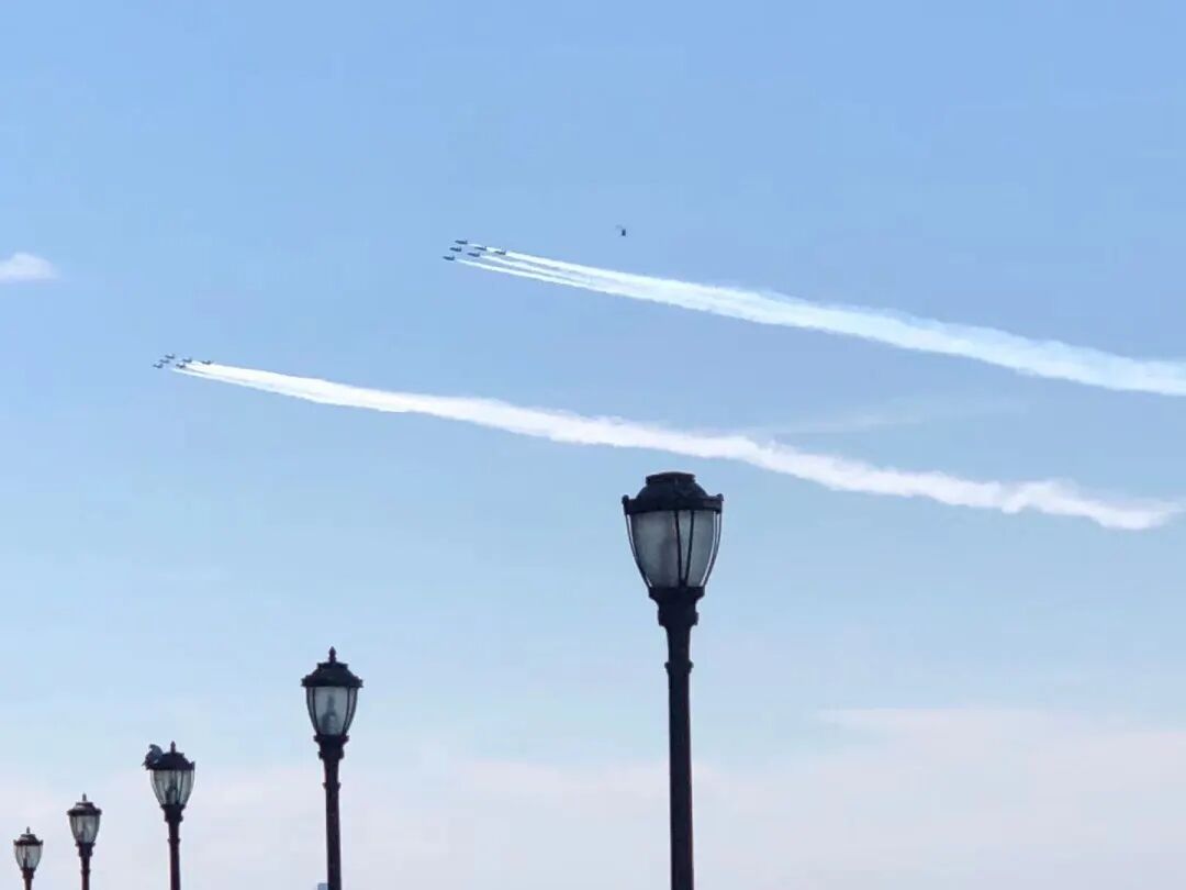 今天上午,美国空军“雷鸟”飞行中队和海军“蓝天使”飞行中队12架战斗机组成的“空中芭蕾”,以红蓝白三色机翼,鹰击长空, 雄浑震天,飞过曼哈顿阳光明媚的上空,这是美国国防部为疫情阴霾下的一线医务人员和我们纽约客送的蓝天之礼。