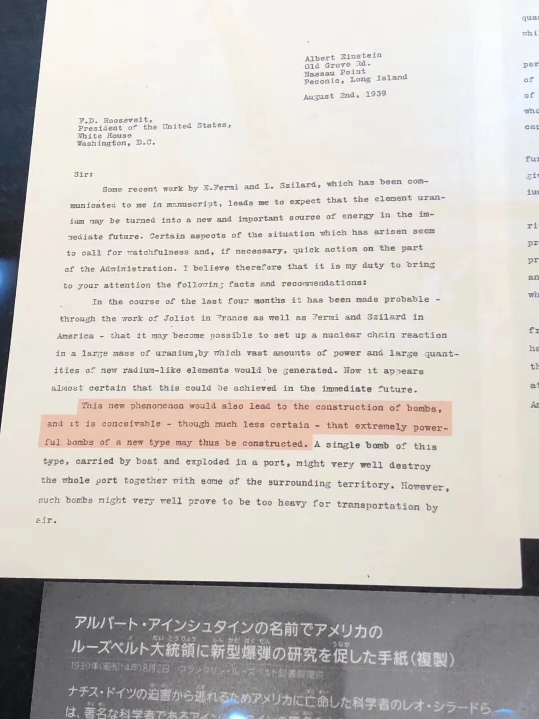 爱因斯坦写给罗斯福关于制造原子弹的秘密信函