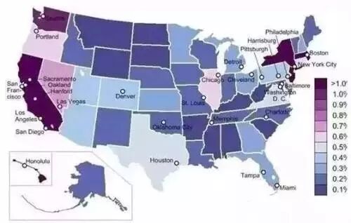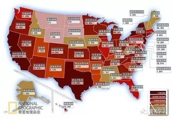 华人在美国的居住很有规律,主要是集中在加州、纽约和大都会城市。