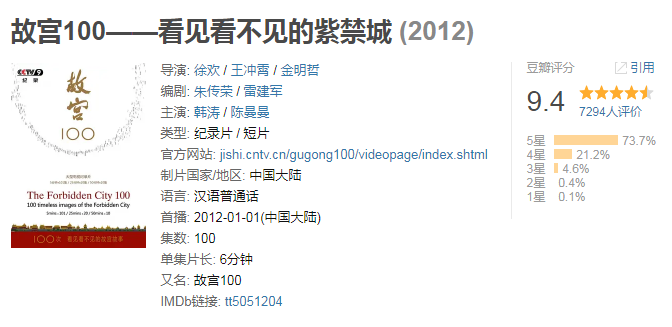 全集共有100集,每集时长6分钟,展现了关于故宫的100个建筑细节。