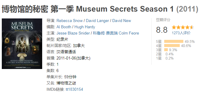 《博物馆的秘密》一共有三季,每季6-8集不等,主要讲的是单件藏品背后的故事,带了点血腥、带了点八卦。