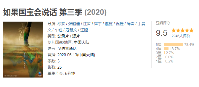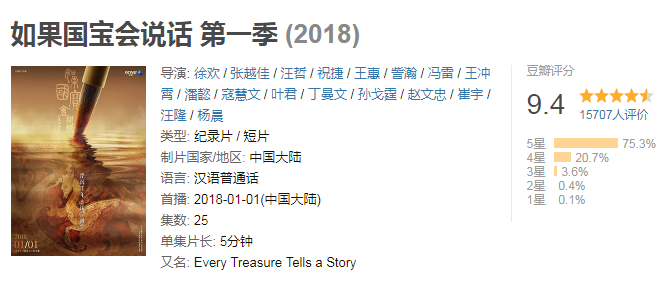 《如果国宝会说话》共100集,分为四季播出,目前已出到第三季。这部纪录片告别了“长篇大论”的枯燥讲述,每集仅有短短5分钟,无论是象征胜利的越王勾践剑,还是充满神秘气息的三星堆人像等国宝,它都以或轻松、或沉重、或唯美、或热血的不同年轻化表达,唤醒了文物沉睡千年的心。