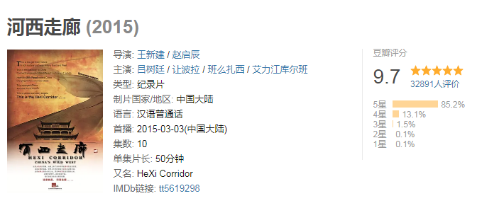 这部纪录片采用“情景再现”的形式,以电影化的拍摄手法,再现了从汉代至今两千多年河西走廊的历史和文化变迁。极佳的历史场景再现、悠扬苍凉的配乐、口齿生香的解说词,让这部纪录片在豆瓣上的评分接近满分。