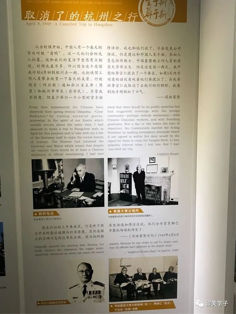 1949年4月初司徒雷登想再回杭州一次,但时局紧张,4月21日"百万雄狮过大江",23日,解放军占领了"南京总统府",