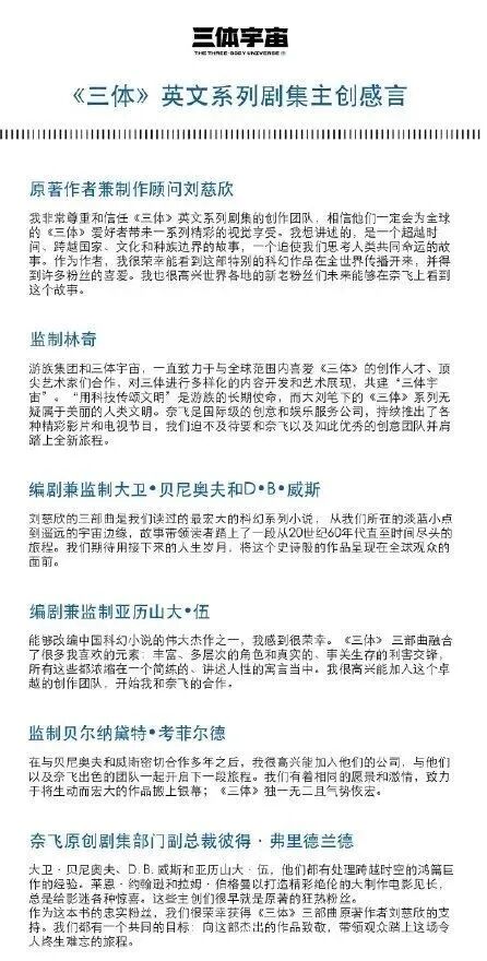 ”我对要改编《三体》以适应电视观众的剧组团队非常尊重,也充满信心。现在我很荣幸地看到这个独特的科幻故事可以穿越国界,获得全球观众的支持。我和新、老粉丝一起期待这个故事在Netflix上映的那一天! “
