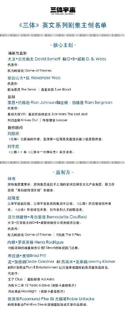 《三体》剧本将由《权力的游戏》主创David Benioff 和 D.B. Weiss 与 Alexander Woo 共同打造。