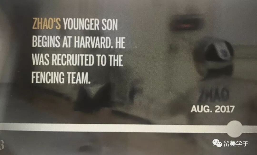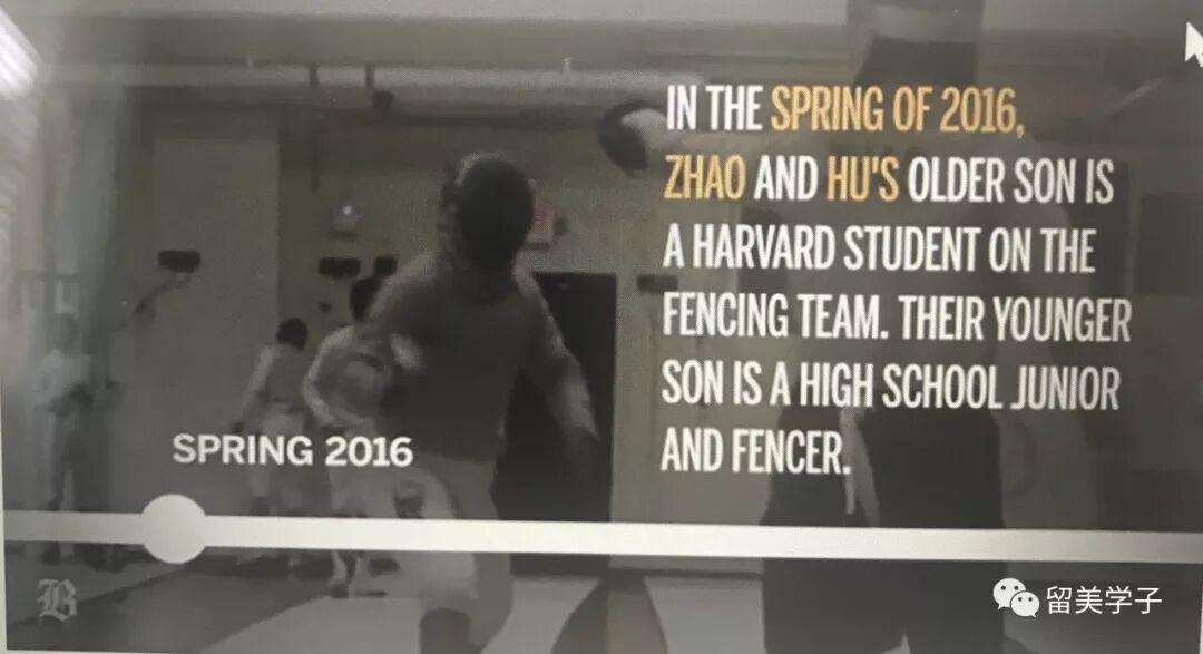 这是2016年赵氏夫妇大儿子在哈佛击剑队的镜头,当时他们的小儿子还在美国高中上11年级。后来他们的小儿子也作为击剑队的运动员,被哈佛大学录取。