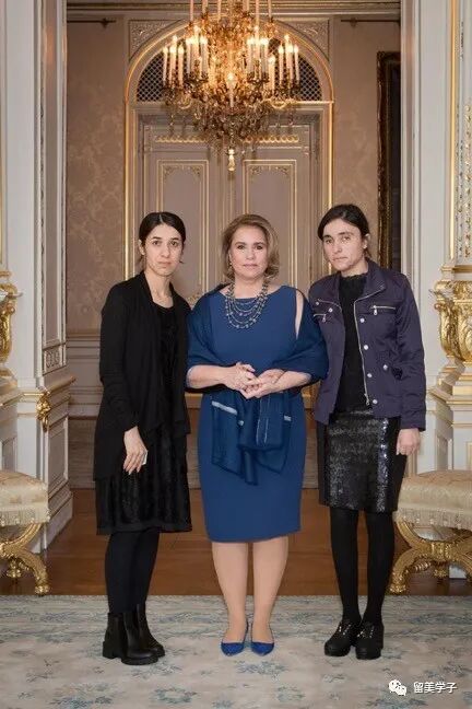 特瑞莎在大公爵宫会见在伊斯兰国中苦难的幸存者,2018年诺贝尔和平奖获得者纳迪亚·穆拉德和萨哈罗夫奖获得者拉米亚·阿吉·巴查尔。