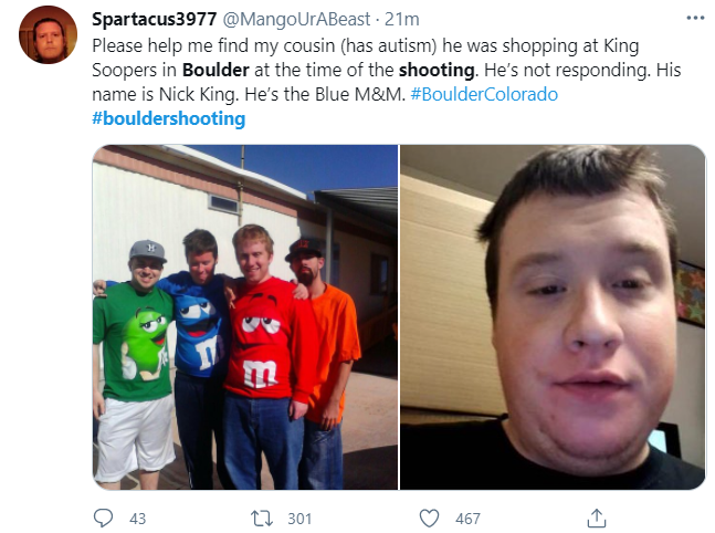 上面图文是家人的求救:“请大家帮我找找我的弟弟!枪击发生的时候,他就在这家超市里购物。他现在不回我们通电话了!”