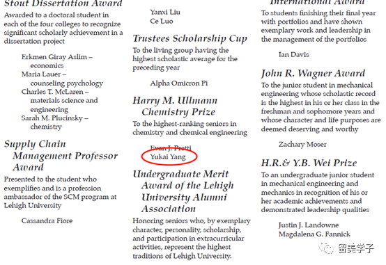 公开资料显示:杨宇楷2015年、2016年、2017年作为优秀学生(Dean‘s list)的获得者,而且2018年他还获得了该校级别最高的化学奖。