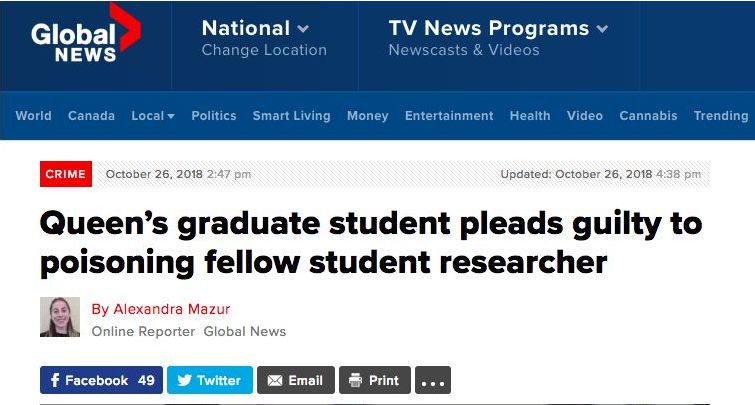 2018年10月26日,中国留学生王子杰(Zijie Wang 音译)在加拿大的法庭上承认了自己向同学投毒的犯罪事实!并在11月2日受到法庭判决。