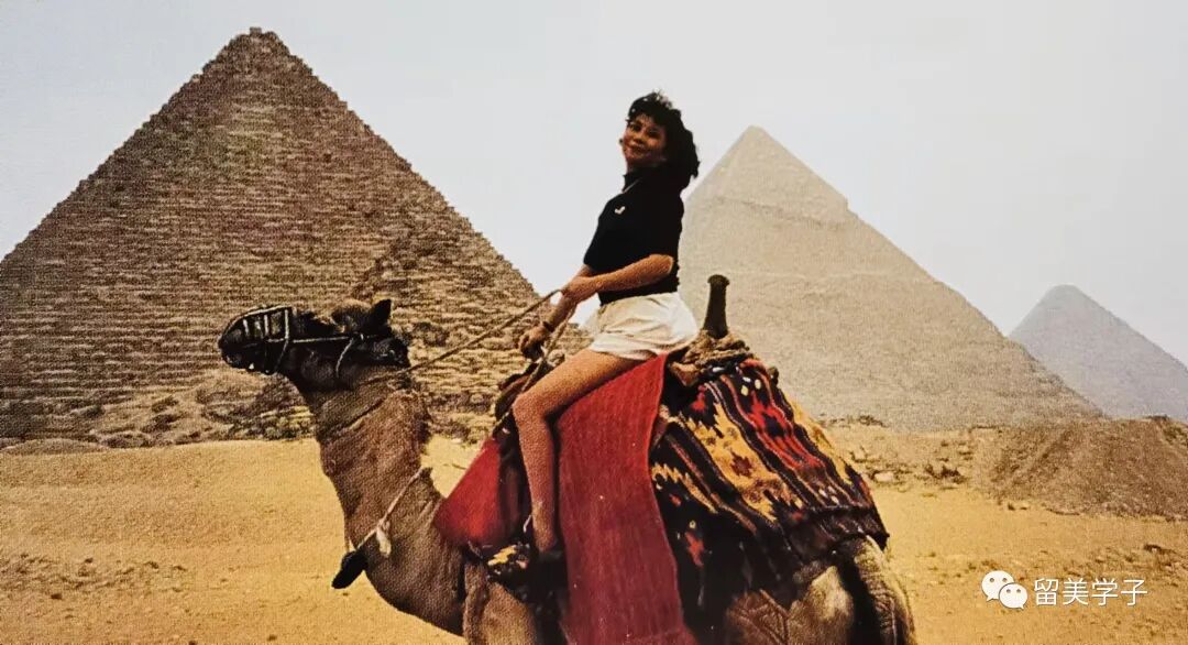 作者周励骑在骆驼背上拍摄的吉萨金字塔群
