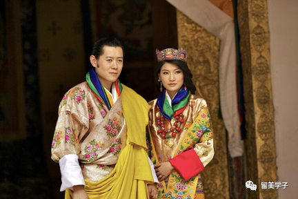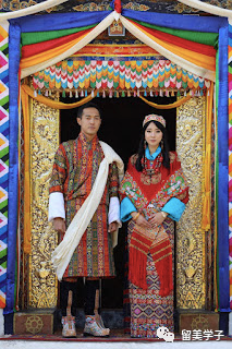 佩玛身穿着不丹传统服装旗拉,色彩斑斓而华贵,据说织成这一件衣服要花费数月之久。她身上所有的颜色,包括佩戴的项链珠宝,都经过严格的占卜和审定,都是对未来美好的祈福和加持。而新郎则身穿爷爷和父亲两代国王穿过的婚礼服装,标志着皇家延绵不断的传承。